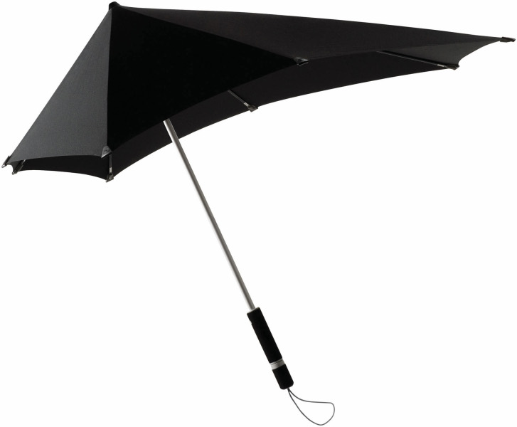 Deze paraplu kan werkelijk tegen het zwaarste weer! Bestand tot windstoten van 80km per uur en zo gevormd dat je gestroomlijnd door de wind en regen kan fietsen!